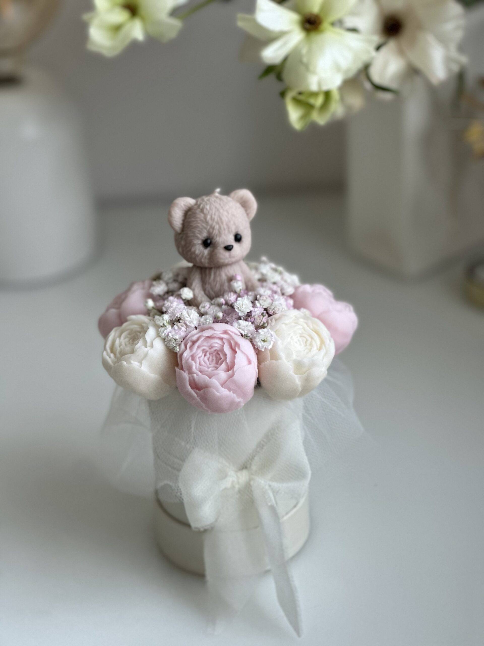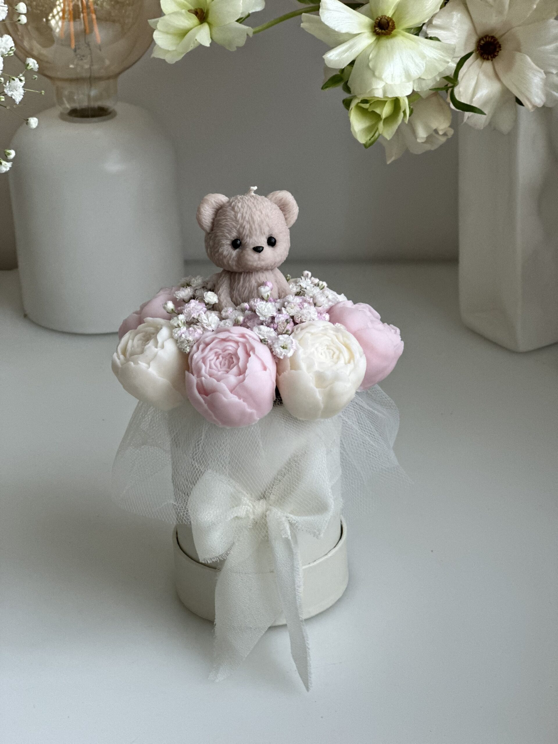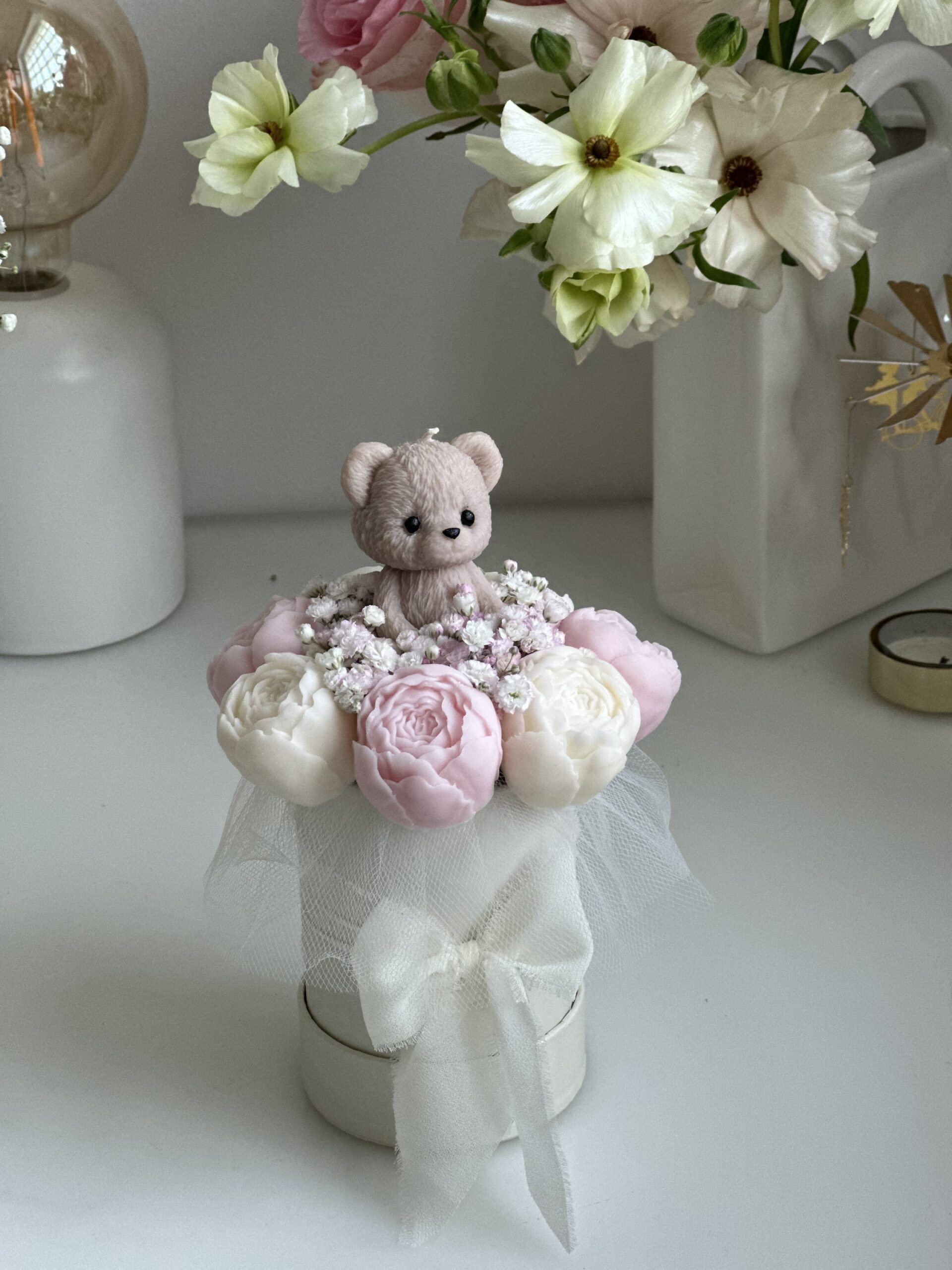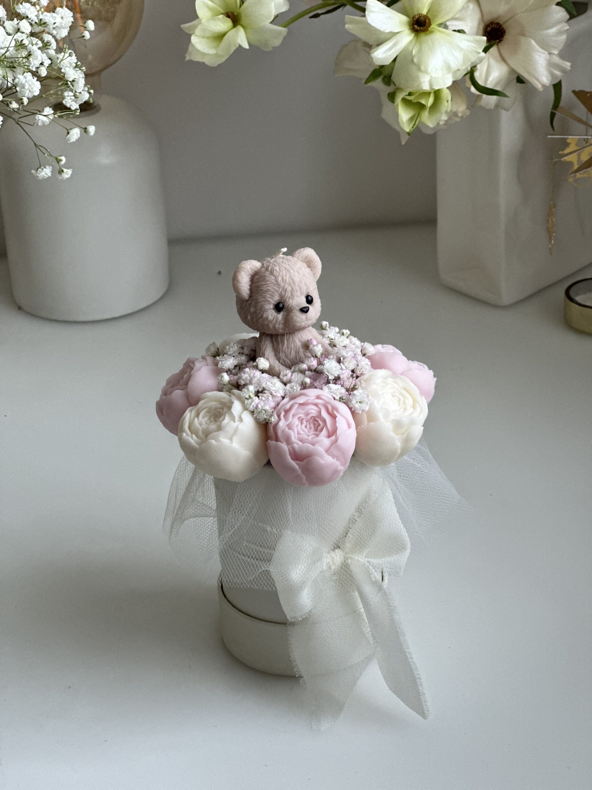 Delikatny flower box z uroczym misiem wykonanym z naturalnego wosku sojowego. Bezzapachowe świece w kształcie kwiatów, ozdobione świeżą gipsówką i tiulem. Rękodzieło stworzone z myślą o wyjątkowym dniu