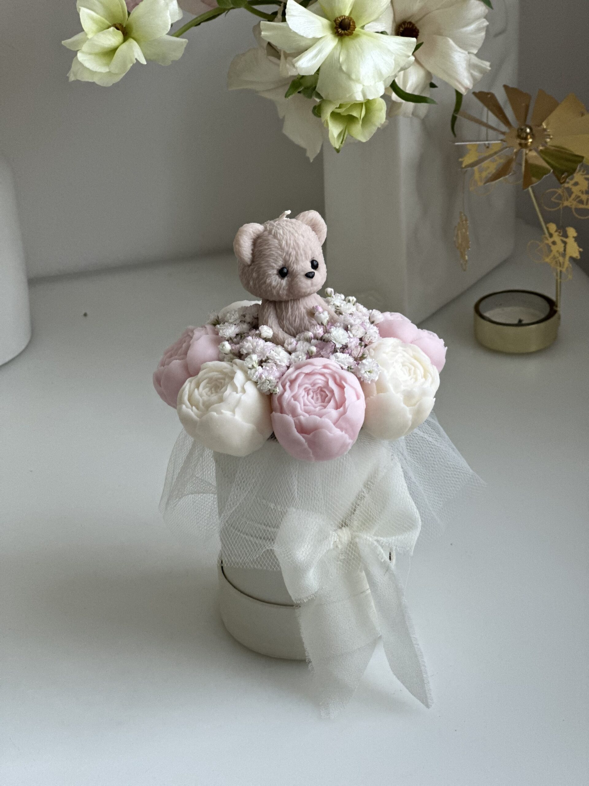 W centralnym punkcie znajduje się uroczy miś, ręcznie wykonany z wosku sojowego, otoczony delikatnymi kwiatami przypominającymi piwonie w odcieniach bieli i pudrowego różu. Całość dopełniają świeże kwiatuszki gipsówki oraz dekoracyjna tiulowa kokarda, dzięki którym kompozycja nabiera subtelnego i eleganckiego charakteru.